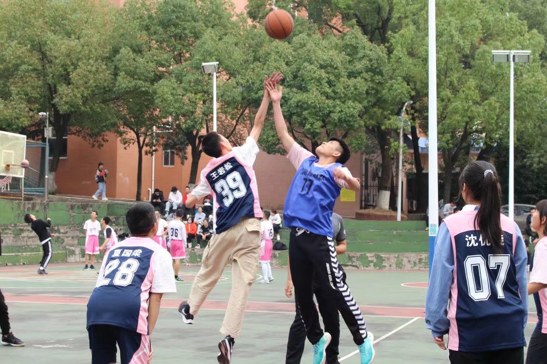 秋风阵阵,第一回合哨声吹响,气氛立刻紧张起来,19新闻联队77号黎瑞雏与20新闻三班28号夏国梁同时腾空而跃,伸手、勾腕、拍球,77号黎瑞雏成功抢得首球,抱球转身,准备传给9号女将陈纪凰,9号顺利接球投篮,首球得分。新闻三班的球员们也在篮筐下迅速散开,准备拦截,18号刘瑶成功截下篮球,立即传给39号王岩松,王岩松快速接球,稍作片刻便投向篮筐,一举拿下本场比赛的首次三分球。19新闻联队1号蒋嘉祺突破重重围阻抢下篮球,瞄筐,抬臂,进篮!19新闻联队配合默契,相得益彰,20新闻三班也不甘示弱,紧追其后。第一回合结束,19新闻联队以28:15的分数稍微领先。