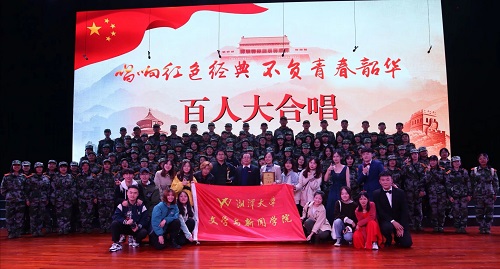 红日初升,其道大光;河出伏流,一泻汪洋。比赛现场,歌声悠扬,各学院以朗诵、舞蹈结合合唱的形式,为我们带来了《不忘初心》、《我爱你中国》、《映山红》、《江山》等精彩曲目,展现了湘大学子良好的精神面貌和蓬勃的青春力量。比赛如火如荼地进行着,现场气氛高涨,唱响了脍炙人口的经典曲目,亦凝聚着一颗颗赤诚的爱国之心。