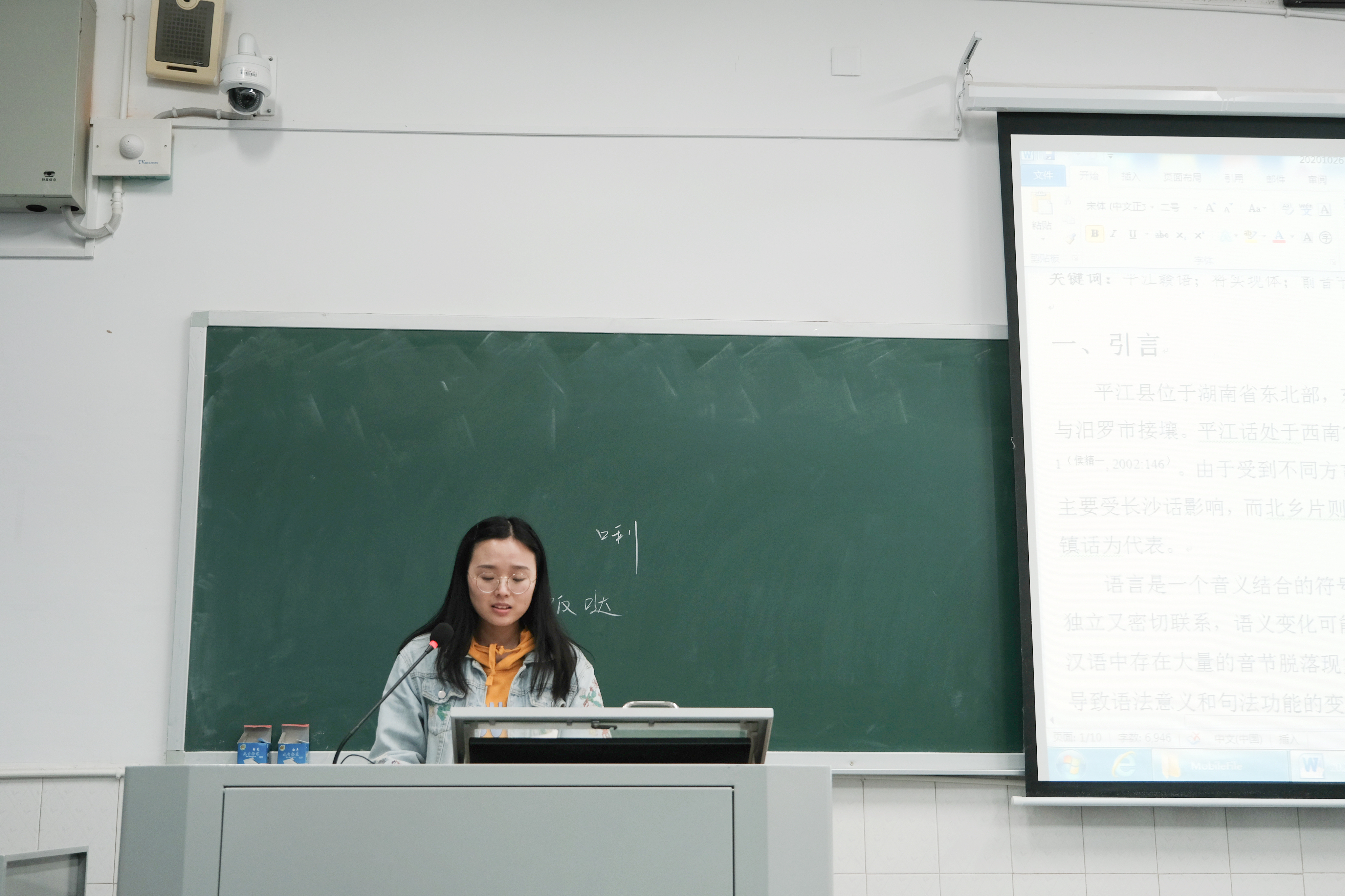 2019级语言学硕士研究生邹珊珊报告的论文是《平江赣语将实现体前音节长化补偿现象》。文章从将实现体前音节长化的语义和功能、将实现体上的前音补偿方式、将实现体前音长化的成因的三个方面论述了该语言现象。