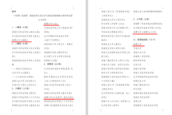 其中,由院党委书记赵猛监制,周凌云、华进老师指导,肖振锋等人创作的作品《道路》凭借其精良的制作斩获大赛一等奖;由夏灿老师指导,谢芬等人创作的作品《光》获评三等奖;由田华老师指导,张婷等人创作的作品《大音希声,韶光无痕》获评优秀奖;由刘晓丽老师指导,刘晨曦等人创作的作品《湘潭二十四小时》获评人气奖。