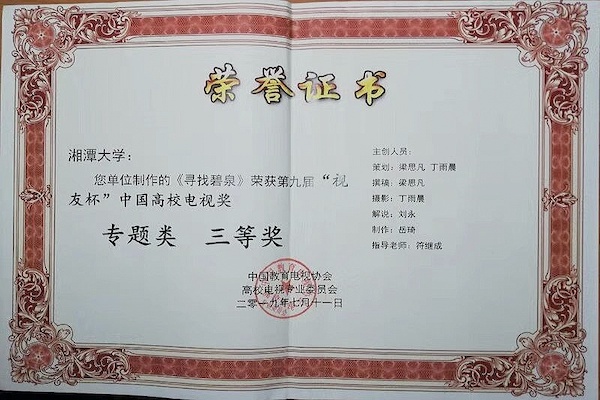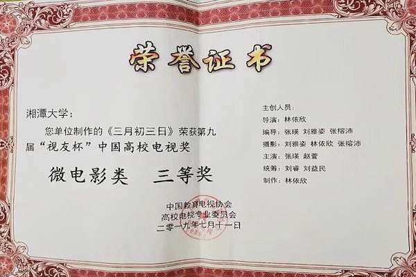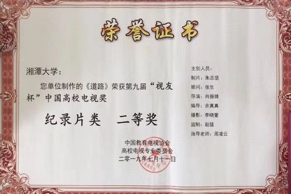 此前,在石河子大学举办的中国教育电视协会高校电视专业委员会2019年年会暨第九届“视友杯”中国高校电视奖颁奖典礼上,湘潭大学亚洲精品国产精品选送的三部作品分别斩获二等奖1项,三等奖2项。其中,由院党委书记赵猛监制,周凌云、华进老师指导,肖振锋等人创作的作品《道路》荣获纪录片类二等奖;由赵猛老师指导,林依欣等人创作的作品《三月初三日》荣获微电影类三等奖;由符继成老师指导,梁思凡等人创作的作品《寻找碧泉》,荣获专题类三等奖。