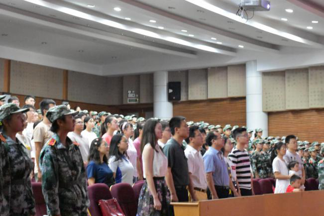 随着李克强总理一声“全场起立、鸣礼炮”的指令,56门礼炮,70响轰鸣,响彻云霄,述说56个民族的中华儿女,70载春华秋实的拼搏。随后举行庄严的升旗仪式,全场师生随着歌声不约而同地站起来,对冉冉升起的五星红旗行注目礼,唱国歌,嘹亮的国歌声在报告厅中回荡。