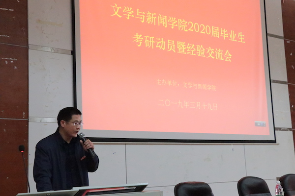 随后,由研究生院副院长周广为同学们做考研形势和政策宣讲。他从三个方面给大家提出了建议:一是信息搜集,大家应该重视考研前的信息搜集工作,提前了解考研现状、拟报考学校的相关信息。二是确定目标。他建议大家根据相关信息以及自身情况来确定目标,多角度考虑问题。三是心态的调整,注意学习方法、关注时事,并且劳逸结合,抵制诱惑,充满信心,认真准备。