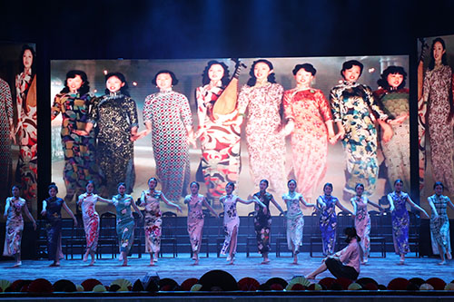 肆艺逢甲子,峥嵘共此时。点缀着花瓣的红色油纸伞悬吊在空中,饶有风味。古色古韵的千里江山图挂在舞台中央,夺人眼球。柔情似水的团扇,装饰着花团锦簇的舞台,如梦如幻,如痴如醉。