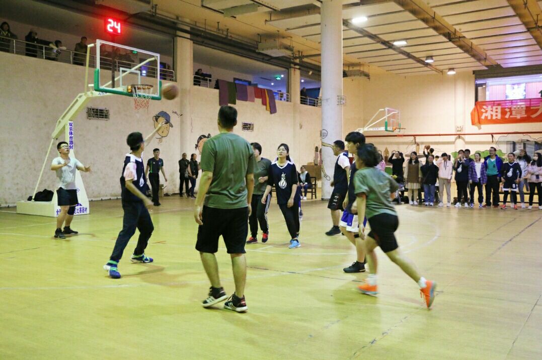 决赛开始前,首先由文新院男篮队与文新院教职工队带来一场精彩的表演赛。双方球员在赛场上大展风采,妙传、三分、变向突破......一个又一个精妙的动作让场上欢呼不停,篮球不断地在空中划出优美的弧线,与清脆的进球声相得益彰,好比琴瑟和鸣,奏出了美妙的篮球音乐,点燃了在场每一个人的热情。最后,文新院教职工队以32:29的比分优势结束了这场胶着的战斗,获得了表演赛胜利。在表演赛双方合影留念后,文新院文娱部带来了精彩热辣的啦啦操表演,让赛场气氛愈发热烈。