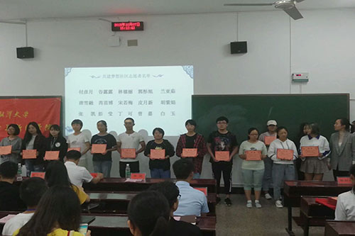 接着由周鹏飞,管胜昔,林瑜分别为获得优秀迎新志愿者,共建梦想社区志愿者和爱心支教志愿者的同学颁奖。随后上学年优秀志愿者代表王云聪上台发言,他回忆了这一年来青年志愿者们不忘初心,砥砺前行的点点滴滴。“我们是朝气蓬勃的一代,我们更是有理想有责任心的一代,我们将严格要求自己弘扬志愿精神,凭借一流的服务展示当代大学生的靓丽风采,树立湘潭大学亚洲精品国产精品的良好形象,为和谐社会贡献自我的一份力量。”发言澎湃有力,掷地有声,赢得了台下阵阵掌声。