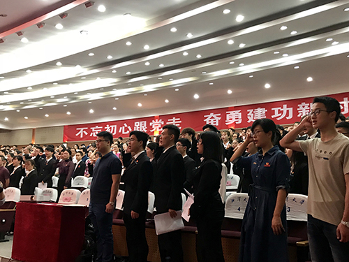“时间划开一道长长的口子,在光和影的重叠处……”大会第一阶段以两位学生代表朗读由湘大教室蒋海文创作的一首言语朴实的诗歌——《湘大之恋》为开始。朗读者声线优美,时而深沉轻柔,时而激情澎湃,给人留下了深刻的印象。随后大家认真专注地观看了2017年度团委工作汇报视频,大致了解了2017年度团委的工作任务和成果。观看视频结束后则进入奏唱国歌的环节。全体起立,奏唱国歌,并由青年代表程安琪同坐带领宣誓,重温入团宣誓仪式。