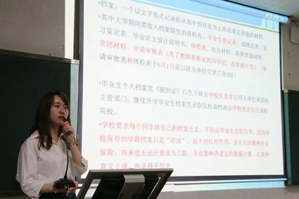 大会第二项,由张姮姮老师讲解毕业工作的相关事宜。张姮姮老师主要从以下几点内容进行讲述:首先是与毕业相关的重要概念,包括就业协议书、毕业派遣、人事档案、报到证等内容。其次为2018届毕业生毕业派遣相关工作安排,包括时间节点、派遣费用、派遣具体方案和相关安排等内容。最后是其他的注意事项。包括就业协议书及考研方面需注意的问题、集中派遣的材料和时间、毕业后办理改派流程、户口迁移问题、毕业生就业派遣时间节点、离校系统的开放与操作步骤等。张姮姮老师细致的讲解使得同学们心中的许多疑惑得以解决。