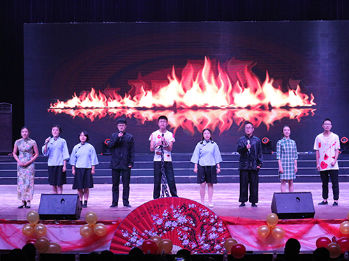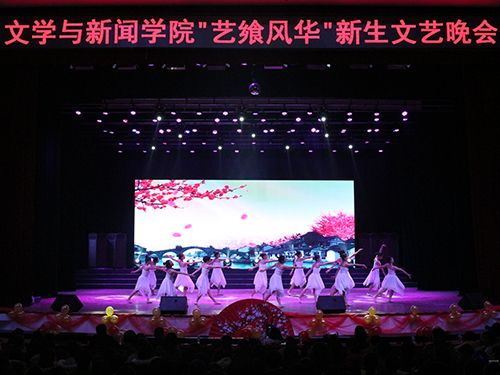 本场晚会以“艺飨风华”为主题。舞台整体布置精致巧妙,富有文艺气息。舞台以红纱为前缀,饰以黄色气球。精美巧致的朱红纸扇置于红纱中央,扇上灼灼桃花,古韵十足。本场晚会共有14个节目,包括了歌舞、朗诵、情景剧等异彩纷呈的内容,为现场观众打造了一场美妙的盛宴。伴随着音乐的律动,观众们秩序井然地进入会场,舞台两侧的微信墙上观众也开始纷纷“打call”。之后,在主持人与现场观众的共同倒计时下,晚会正式开始。