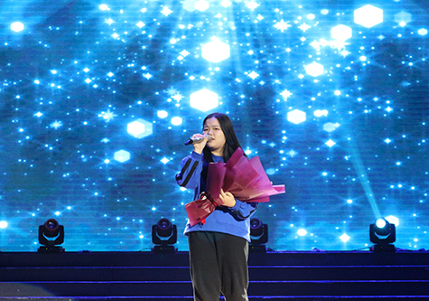 阵阵古筝声,由远及近飘来,白红相间的羽扇随着舞步的变换一开一合,炫彩夺目。白衣素裹,巧笑倩兮,盼目神飞,“艺飨”队派出的节目为17新传1班的舞蹈《十面埋伏》,在灯光的映衬下,给观众呈现了一场精美的视听盛宴。随后,则是属于“风华”队的2016届“校园十佳歌手大赛”冠军江筱璐学姐为我们倾情演唱的歌曲《你就不要想起我》。湛蓝的灯光洒落一地,缀着细细光点,犹如夏夜中的满天繁星,美丽至极。“我都寂寞多久了还是没好,感觉全世界都在窃窃嘲笑”,细腻温柔的嗓音,深情投入的模样,轻闭着眼,一字一句唱出令人神伤的话语。情绪低凉,深情低沉,声泪俱下,令人久久不能忘怀。一首曲罢,掌声阵阵,不绝于耳,回味不已。