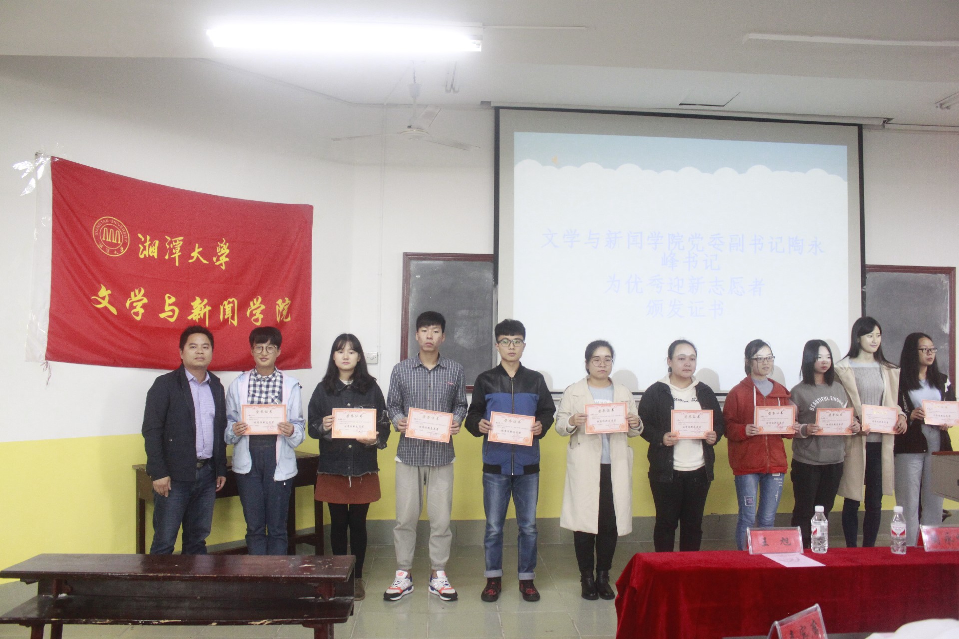 大会第五项,由青志部部长谢一迪进行了志愿活动介绍,简单介绍了部门举办过的具体活动。爱心护书活动是湘潭大学创立最早的图书馆志愿者服务活动,十个春秋里,我院的护书活动始终积极开展并获得了广泛认可。青志部还组织开展了寝室绿色行动,简单的废品变卖和捐款却让贫困学子感受到了来自湘大的温暖,也展示出了当代大学生应有的风采。共建梦想社区、爱心血库、湘江行、关爱孤寡老人与留守儿童等等各色活动,为社会送上了一份又一份温暖,用实际行动证明了一颗颗善与爱的种子已在大学生心中生根发芽。活动中也涌现出了一大批优秀志愿者,王海华、马志远、丁振兴等多位同学分别获得优秀迎新志愿者荣誉,由陶永峰书记亲自为他们颁发证书。同时,管胜昔老师、王旭老师为新上任的“共建梦想社区”志愿者发放了志愿者聘书。