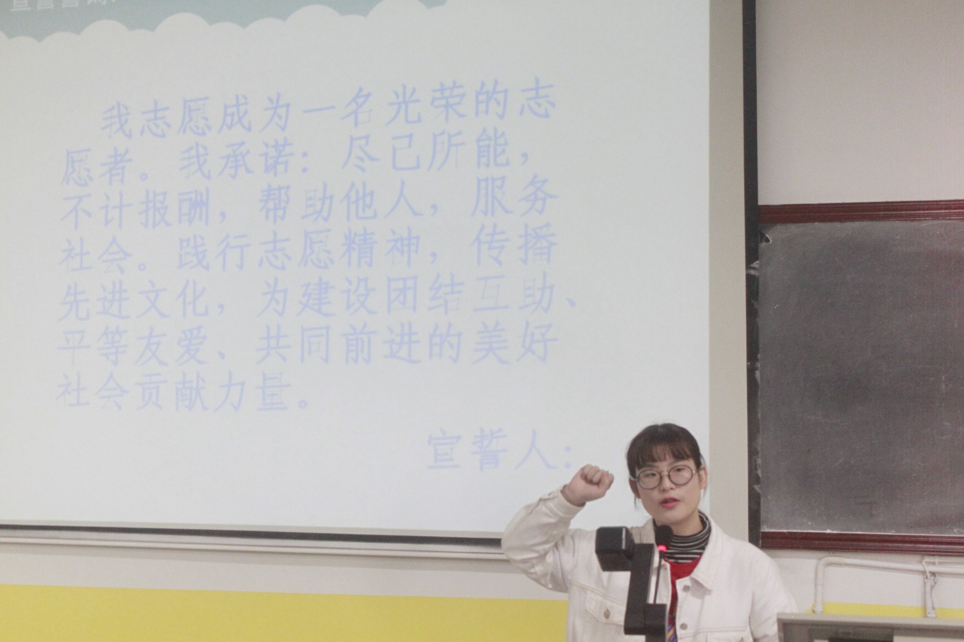 “尽己所能,不计报酬,帮助他人,服务社会。”团委第一副书记贺纯主持,到场志愿者们激情澎湃进行宣誓,表打了对志愿工作的决心和期望。