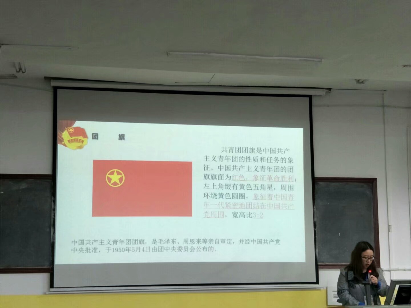 第一部分,由组织部副部长牟元梅为大家进行团的基本知识讲解。团的知识讲解分为四个部分,分别是团的历史沿革、组织原则和基本任务、入团条件和组织特征。