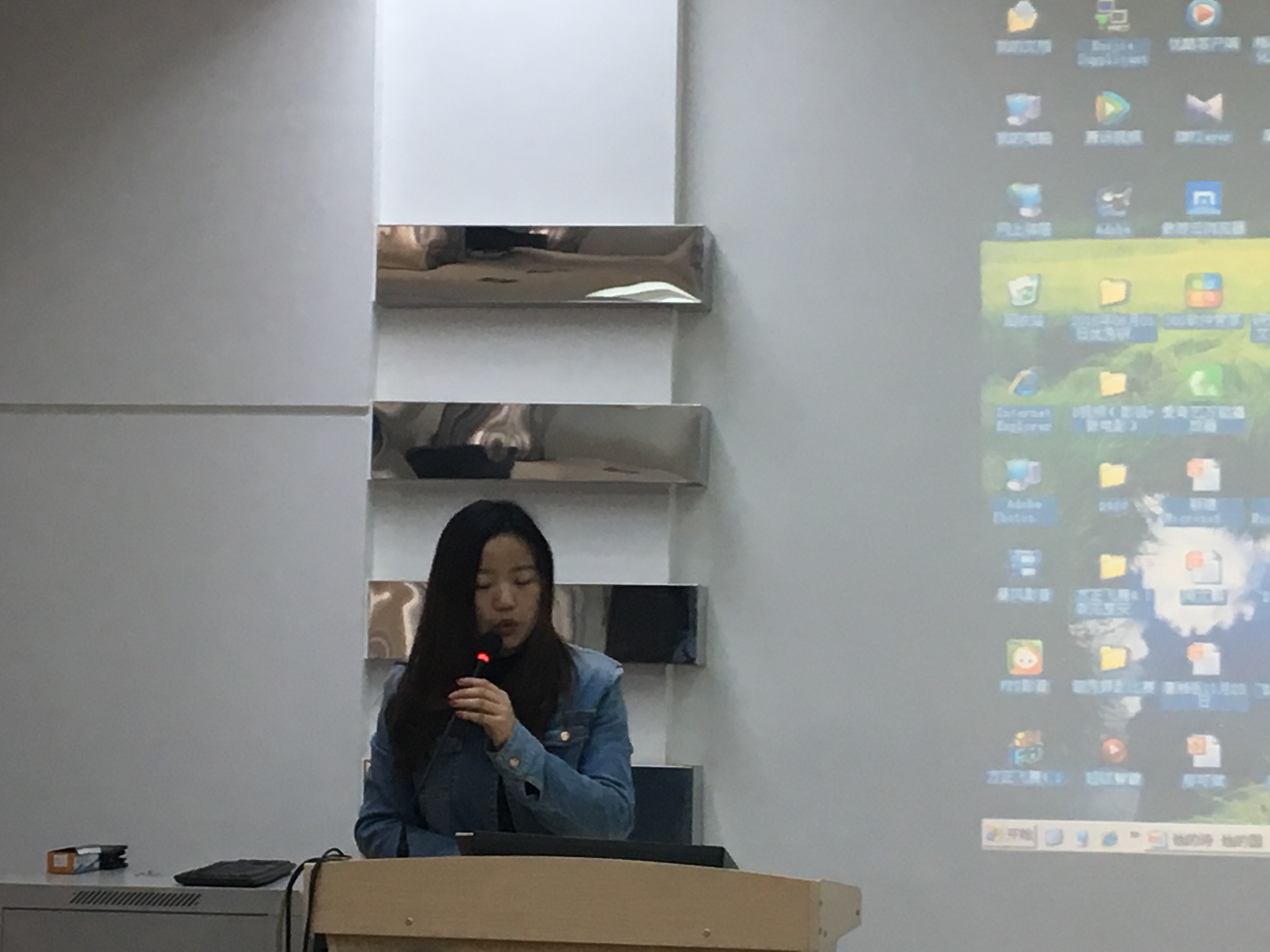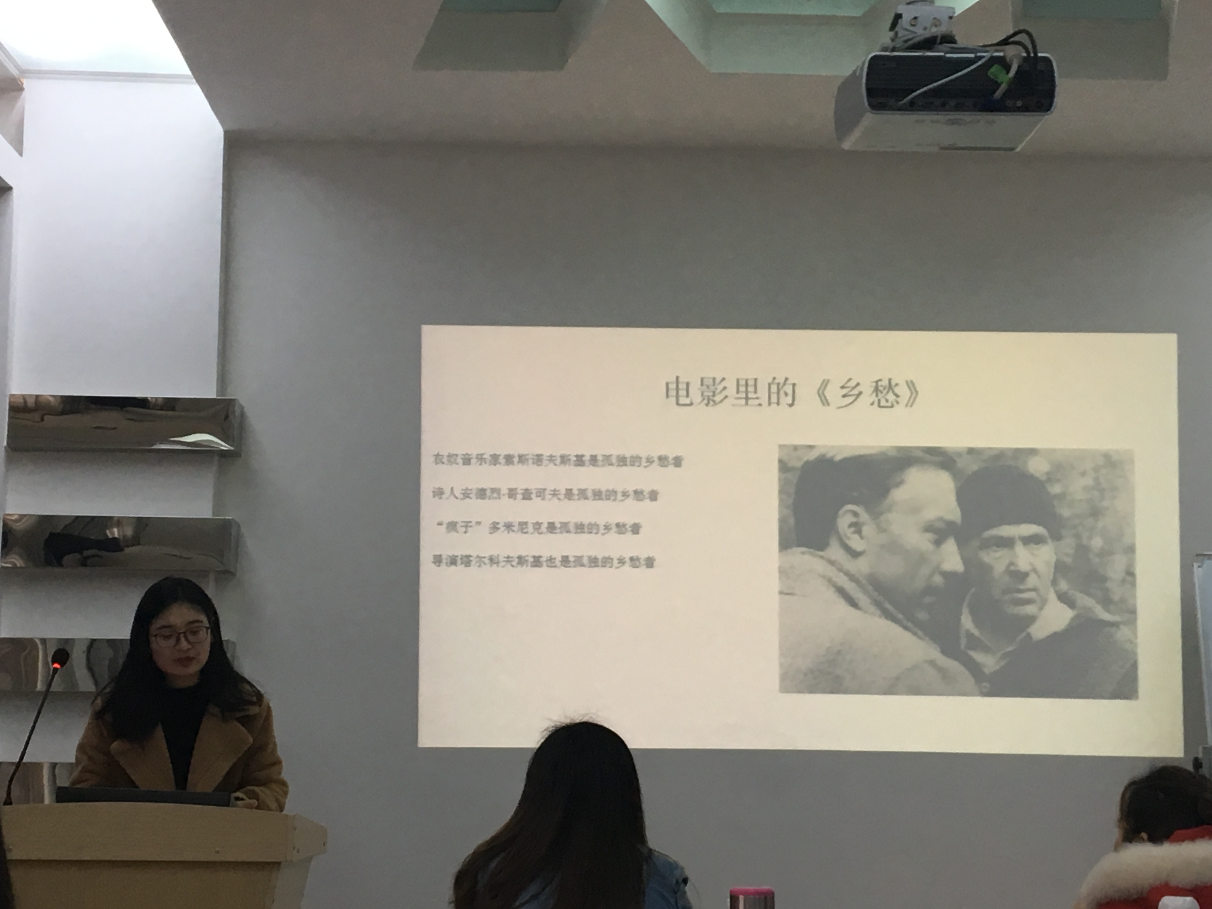 张倩倩同学第一个走上讲台,她讲述的是《他的诗,他的国》,通过对安德烈塔可夫斯基的乡愁的讲述,用诗一般的语言,结合诗与影片,带领着大家感受文字与哲学的魅力。