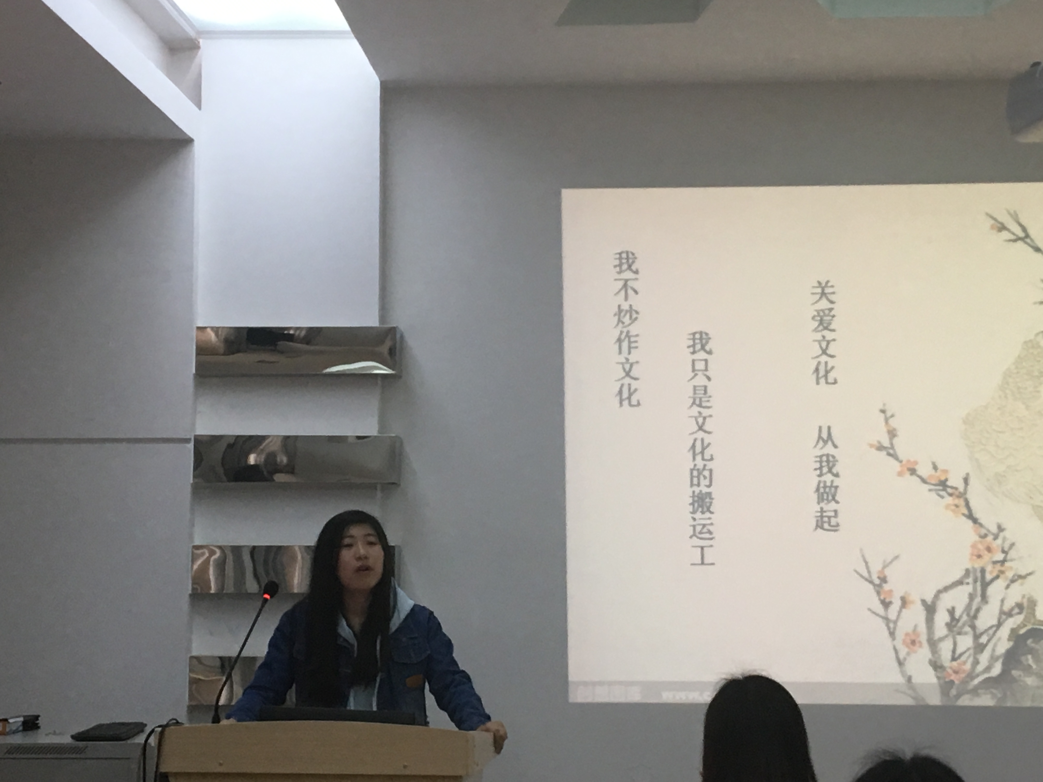 第二个开讲的是2016级文艺学李璐同学,她讲座的题目是《国家级非物质文化之民间社火大解密》,她风趣幽默地向同学们介绍了民间社火及社火的具体活动,让同学们对社火这种民间传统活动产生了浓厚的兴趣。同时,李璐同学也表示了对社火传承问题的担忧,希望传统文化能够受到重视。