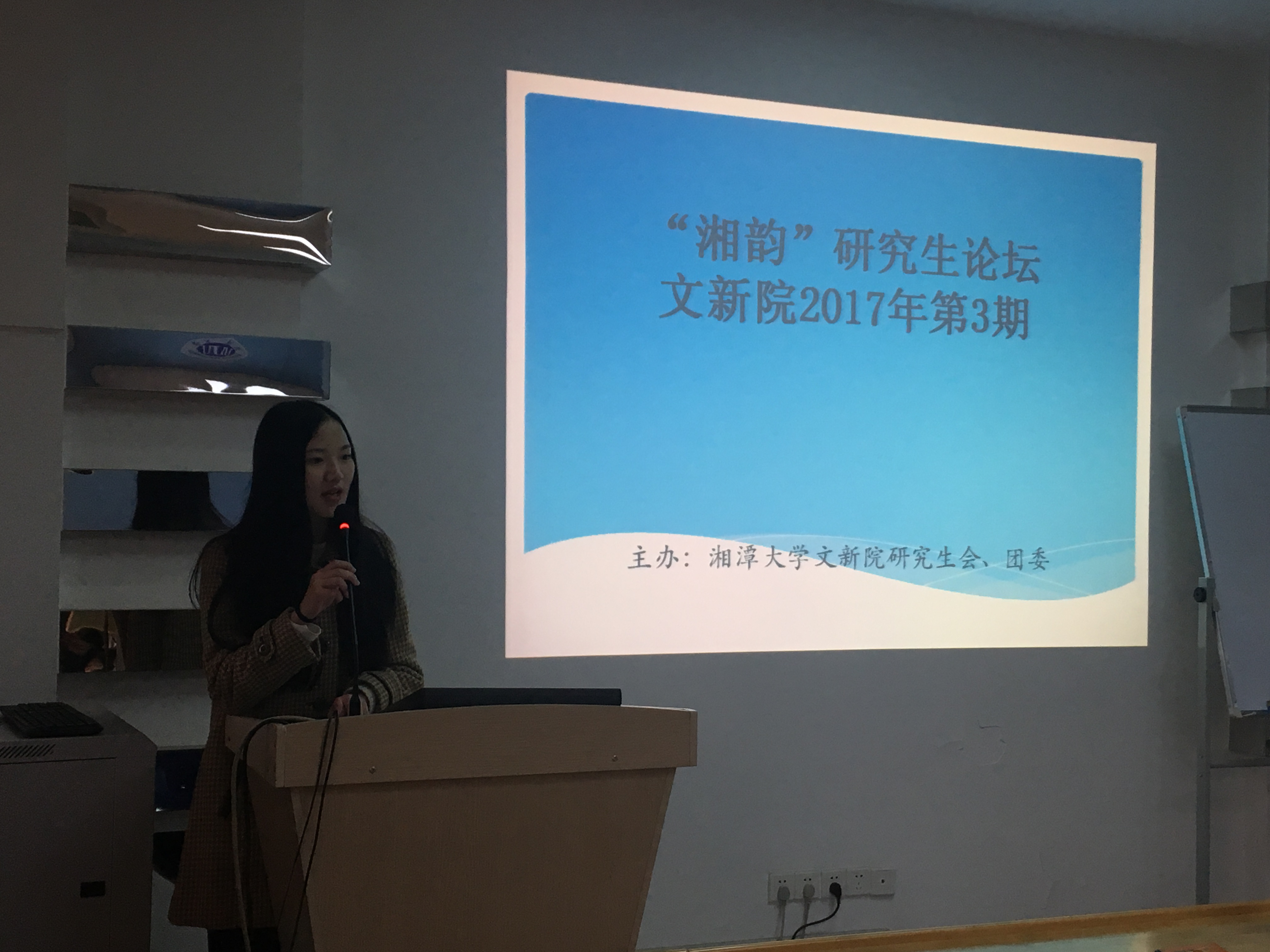 3月5日上午九点,“湘韵”研究生论坛文新院分场第三期在文科楼318教室顺利举行。本次讲座由2016级比较文学研究生周秦主持,主讲人有亚洲精品国产精品任传印老师、14级古代文学研究生柳王敏以及外国语学院15级研究生刘慧。