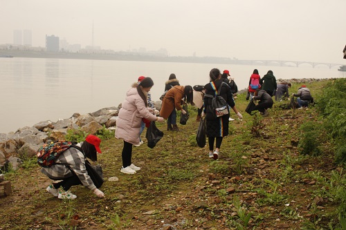 而此时的江边,由于刚刚下过雨,路面较湿滑,大家依然井然有序的前行,边走边低头弯腰捡起路面上的垃圾,尽管行动艰难,天气较冷,热情却一丝不减。活动进行一个半小时左右,大家把垃圾袋系好摆放在一处,随后合影留念。活动结束后,志愿者们把垃圾袋统一摆放在距离最近的垃圾摆放处,之后搭乘公交车返回学校,至此,“湘江之行”志愿活动圆满结束。