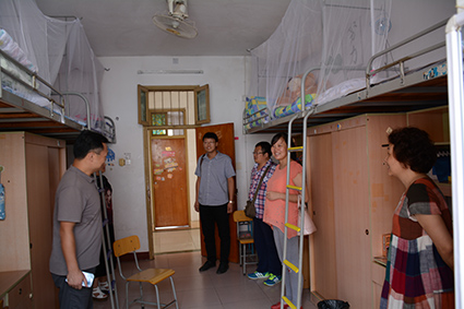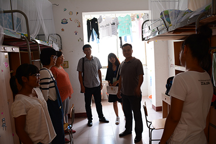来到新生寝室之后,王洁群书记对新生表示欢迎并与他们亲切地交谈,询问了新生们入住寝室后的住宿、饮食等情况以及教材的领用问题。新生普遍对住宿情况比较满意,并表示会学着适应并习惯。我院团委书记管胜昔老师向新生询问寝室的设施条件如何,以及装修部分是否有遗漏。在新生指出寝室的设施不足之处时,管老师第一时间安慰新生不要着急,并承诺会在新生报道工作完成后让各班辅导员统一报修。