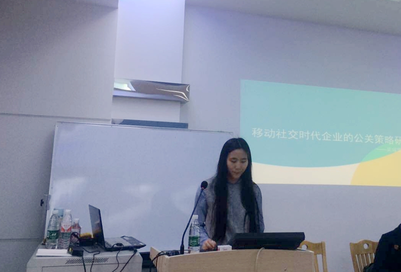 接下来上场的同样是来自2014级广告学专业研究生的吴瑶莹,她为大家带来的是“移动社交时代企业的公关策略研究”,从最典型的移动社交软件微信谈起,分析在移动社交时代中,作为一个公关人员应该注意的各方面问题,如何止损,如何恢复品牌的形象和公信力,是她演讲的重点。同时,她也提出了一系列的公关策略,这对同学们这方面的知识有很大的启发。
