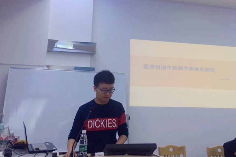 接下来上场的刘泳辰同学是来自2014级传播学专业研究生,他为我们带来的是“医患报道中的平衡性研究”,他从最近的喜欢纠纷事件的报道谈起,,分析其中报道这类事件的媒体采用的态度和扮演的角色。他认为,作为民众知晓真相渠道的新闻媒体,在报道此类事件中需要有社会公德心,但也不应有所偏袒,应坚持正确的舆论导向,最重要的是把握一个度,做好二者间的平衡。