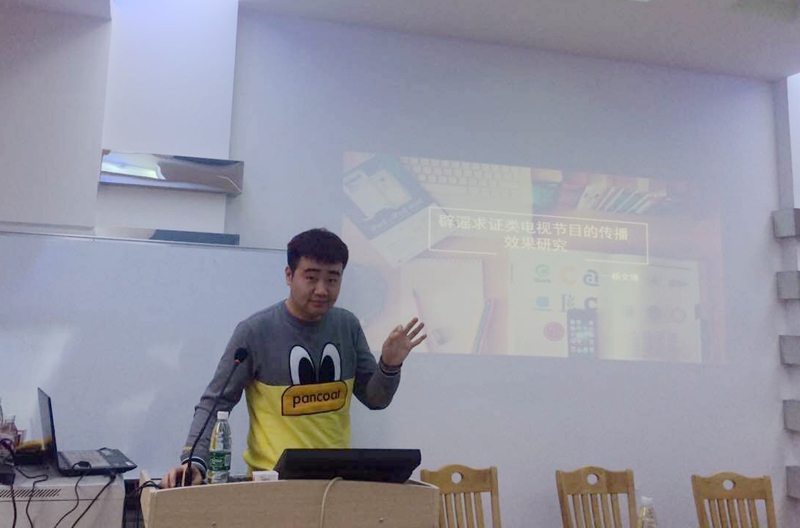 第一位进行学术分享的是来自2014级新闻传播学专业研究生杨文博,他带来的是“辟谣求证类电视节目的传播效果研究”,其通过一系列的案例分析,将同学们带到一个追求真理的电视节目当中,大家都听得十分投入,杨文博同学深入浅出,依据丰富的理论知识和案例将学术问题,讲得生动有趣。演讲进行到高潮时,观众席不由自主的爆发阵阵掌声。