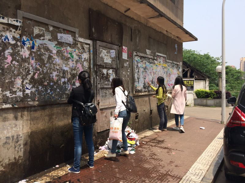 同一时间,北苑新传支部的志愿者也到达集合地点,在王娜的带领下,走向建设银行北苑点的墙边,开始漫长的清理工作。大家互帮互助,先把大面积的广告撕下来,再用小铲仔仔细细的将紧贴在墙上的残余剔除掉,每一个人都十分认真。