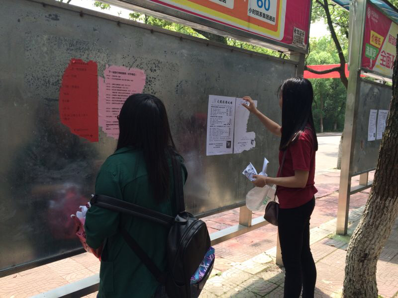 中午12;30,文学支部的志愿者在学生活动中心集合。在负责人倪婷婷的带领下,大家很快戴上手套,拿起工具,积极投入到清理工作中来。南苑的公告栏上常年贴着各式各样的小广告,清理起来很有难度,大家顶着烈日,坚持将小广告清理干净,还学校一个干净的公告栏。