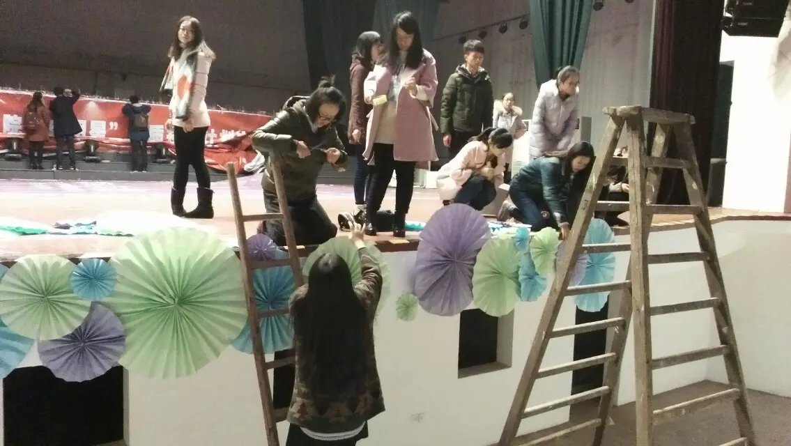 南方气候潮湿,可这种潮湿有时候不见得是一件好事。比如你会发现洗了好几天的衣物依旧没干。再比如,你发现前几天耐心制作的折纸已失去的该有的样子。这一天,广告部一大早从金翰林画室搬来的手工折纸,四周不再硬挺。大家只得蹲在地上,将每一条折痕压实,递给另一旁的同学,粘在舞台上。