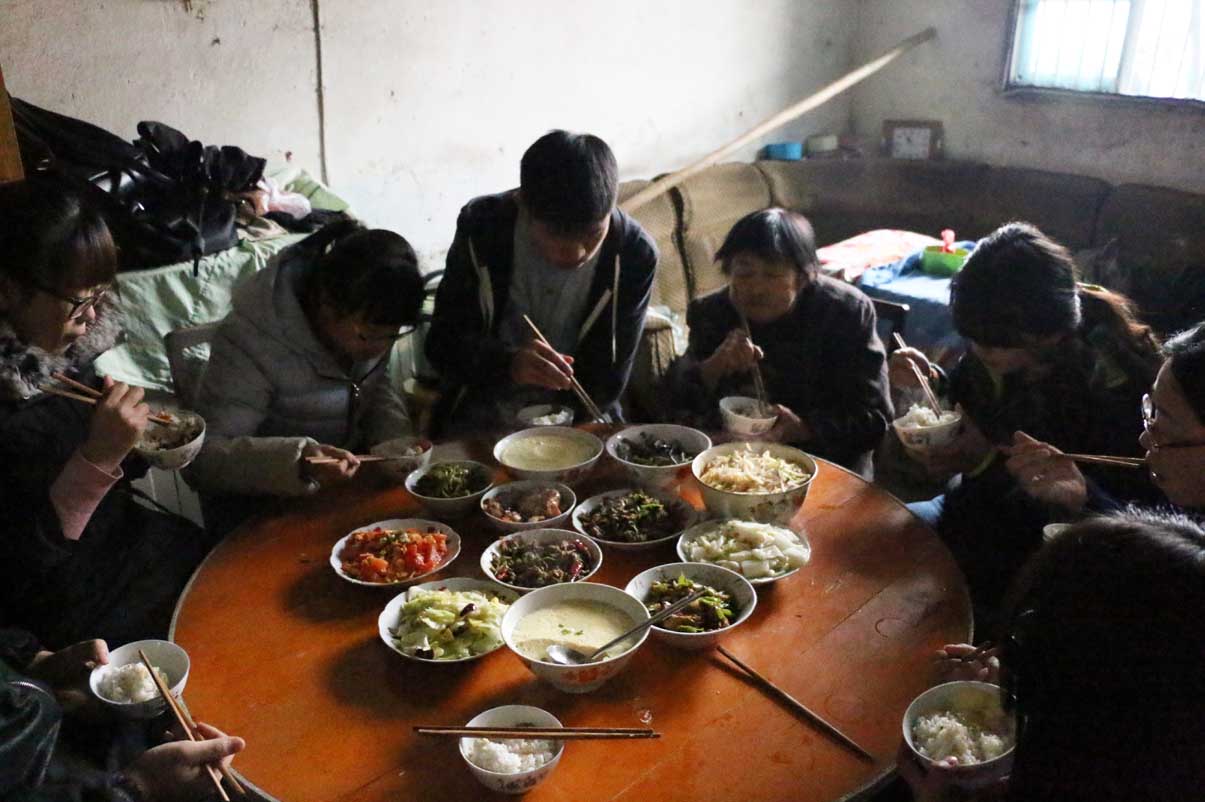 志愿者与石奶奶围坐在一起吃午饭