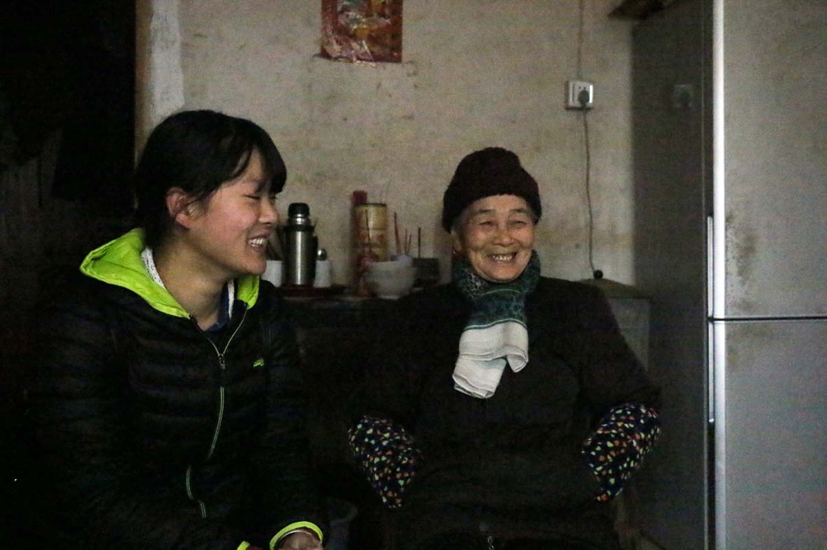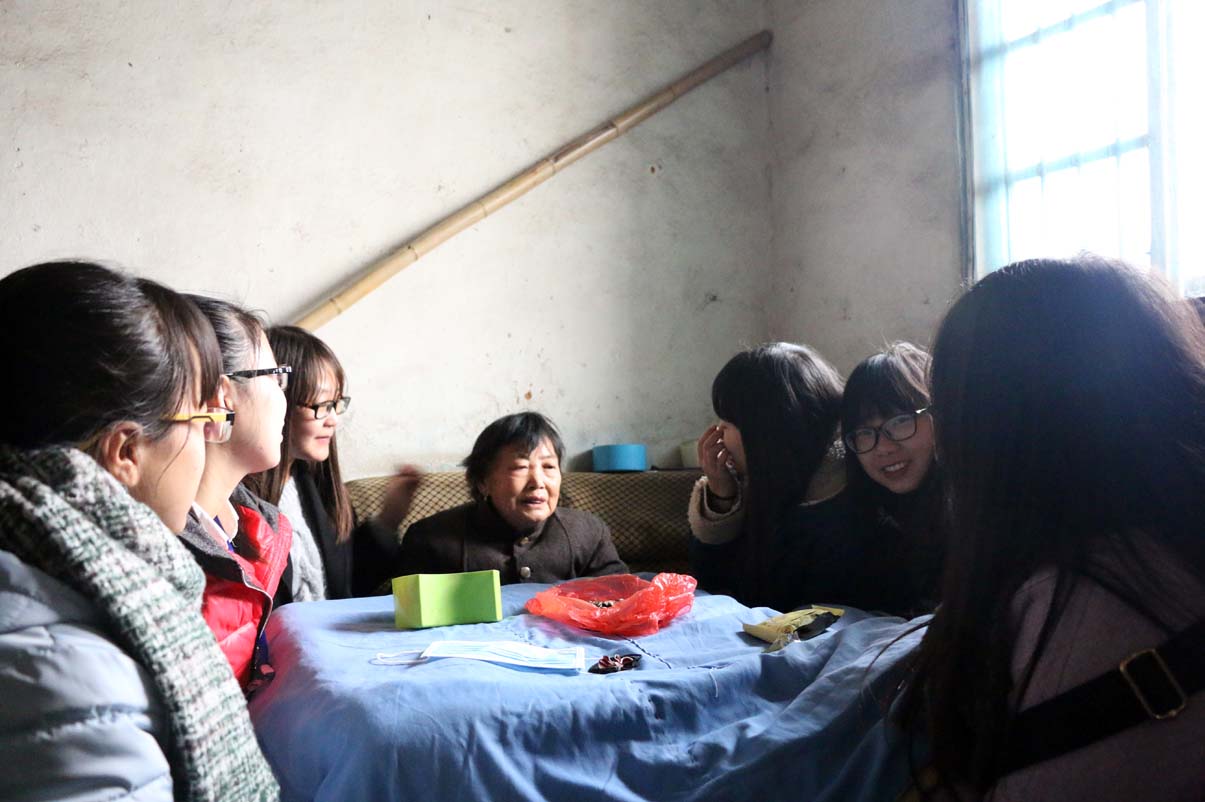 记者随一行志愿者来到石奶奶家时,一组志愿者正与奶奶围坐在火炉旁聊天,奶奶精神焕发,一脸笑意。石奶奶年逾古稀,背有些微驼,但和蔼慈祥,一直面带笑容。奶奶对我们的到来感到很开心,一直与我们分享她年轻时的故事,后来谈及自己正在上大学的孙子时,更是笑意盈盈。