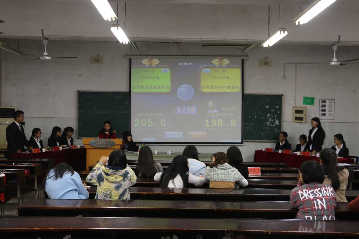 11月7下午2:30,“文心杯新生辩论赛在经管楼202教室拉开帷幕。辩论双方分别是,前者代表正方,支持"高等教育应宽进严出"的观点;后者代表反方,支持"高等教育应严进宽出"的观点。担任该场辩论赛评委的有翟晓灵,朱敏和敖君。最终,15中文一班的戴炜烨获优秀辩手称号,而15中文二班获得了本场辩论赛的胜利。