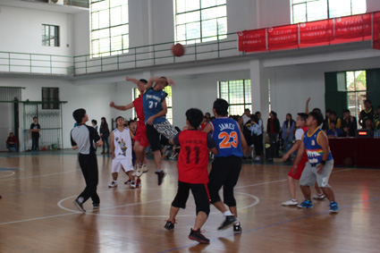 中场上演师生表演赛,老师队由王洁群,雷磊,刘中望,周建军,符继成,周亚霆以及郭凤安等老师组成,与学生代表队对战。19号郭凤安老师表现突出,喜欢快攻,几次进球。老师队配合默契,可惜运球不佳,几次被学生截走得手。双方左右轮换,轻松交手,最终比分30:14,老师队更胜一筹。