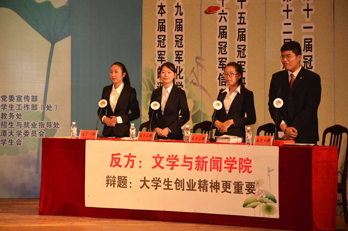 2015年5月12日晚七点半,湘潭大学第二十届“百灵鸟”杯辩论赛决赛暨闭幕式在俱乐部准时召开。本次活动的嘉宾有副校长周益春,副校级督导刘建平,学生工作处处长谢罗奇,学生工作处副处长胡阳,教务处处长周琦,教务处副处长王协周,团委书记齐绍平,团委副书记吴彬彬,团委老师马天华以及各院系团委老师、各场比赛评委老师、宋金亮各院系同学们。本场比赛评委有教务处副处长王协舟、哲学系教授高捍东、历史党委书记、教授肖芳林、法学院及知识产权学院副院长、教授肖伟志、中国现代外国哲学学会理事、湖南省大众语言研究会辩论专业委员会副主任委员、湖南省演讲与口才协会辩论专业委员会副主任万丹、信息工程学院副院长、教授段斌。由李丹和孙文担任主持人。