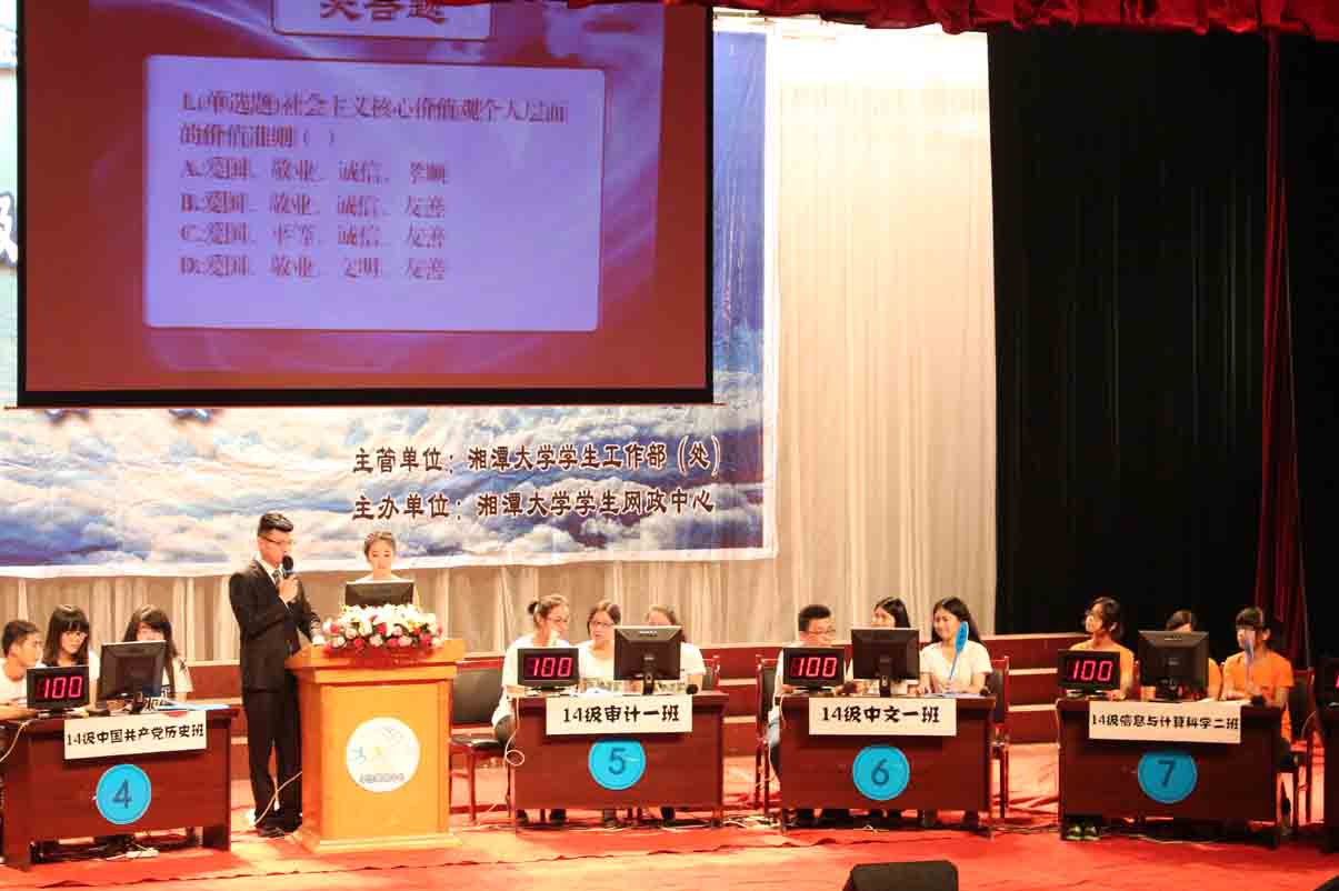 比赛共分三轮。第一轮“积少成多(必答题)“,每个班依次作答,答对一题加二十分,答错或违规扣十分。在本轮比赛中,我院参赛班级中文一班沉着冷静,机智应答,最终得分为140分,同最高分14级行政管理二班相差三十分。第二轮比赛为“抢占先机(抢答题)”。14级中国共产党历史班在本轮中表现抢眼,多次获得抢答权,和14级人力资源管理二班共同夺得本轮最高分180。我院14级汉语言文学一班仅获得一次抢答权,分数上升至160,在八支队伍中稍稍落后。比赛转眼进入最后一轮“步步为营(风险题),共有八个题库,每个题库五道题,依次分值为 10,20,30,40,50分。在本轮比赛中,我院同学后来居上,连答多题,并灵活采取场内求助的方法,最终取得240分的最高分。