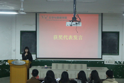 紧接着,文娱部的曹文昱作为优秀干事代表进行了发言。她说自己十分享受在文娱部、在学生会工作的经历,让她获得了能力的提升,也结交了好友,感受到了文新大家庭的温暖。她提议,文新院学生会的同仁们,应当说我们该说的,做我们应做的,改变我们必须改变的,实现我们一定要实现的,为文新院代言,更好地服务大家,打造更棒的文新团队。随后,体育部副部长鲁晓婷和办公室主任王依分别代表优秀部长和优秀部门进行了发言。鲁晓婷与学生会全体成员分享了三个愿望:努力学习,努力工作,做好自己。王依则向大家具体介绍了办公室的工作内容:包括整理档案,上传下达,分发通知等繁琐的日常事务,并真诚感谢大家对于办公室工作的肯定,表示会继续努力,提升业务能力。