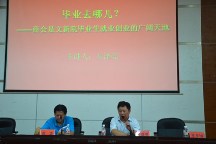 紧接着,左泽亮先生做了以“毕业去哪儿”为主题的讲座,简介了商会的历史由来,围绕“商会是文新院毕业生就业创业的广阔天地”,讲述了深圳市湘潭商会和湘潭大学深圳校友会的特殊关系、深圳市湘潭商会的运作模式和商业实践等情况。此外,左泽亮先生还介绍了商会在促进湘潭和深圳两地合作、公益慈善、文化宣传等方面作出的努力,展示了成立不到2年的商会所取得显著成绩。他还鼓励同学们努力学习,积极进取,并向文新院的学子发出了诚挚的邀请,欢迎大家前往深圳实习、就业和创业。