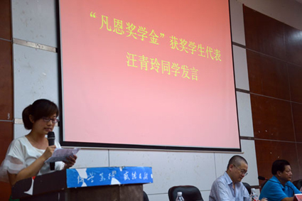 之后,汪青玲同学作为获奖代表发言。她简述了自己的家境和大学期间的兼职、学习经历,以及对父母的感激和牵挂,表达了自己对凡恩公司以及高源先生、左泽亮先生和王冬梅女士的感激和敬意,感谢他们给许多追逐梦想的人的支持和鼓励。最后,汪青玲表示:“感谢凡恩公司给予我们的帮助,我们会一直在自己的梦想之路上前行。未来我们也将尽自己最大的努力,为社会付出一份自己的力量,为社会献出一份爱心。”一番真挚之言,引起在场同学的共鸣。