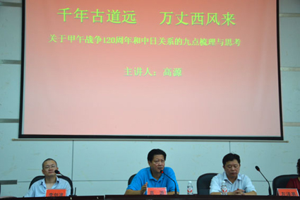 随后,是高源先生 “千年古道远,万丈西风来——关于甲午战争120周年和中日关系的梳理与思考”的主题讲座。高源先生从中日现代化过程的对比,日本对中国近代历史和现代化的影响,抗战前中、日、美综合国力对战争的影响,日本对二战侵略的反省等方面进行了阐述。通过梳理历史史实,高源指出,甲午战争是两千多年来中日关系发展的必然结果,而百余年来的中日矛盾都是甲午战争的历史后遗症,处理当前的中日矛盾、缓和关系需要政治智慧和历史韬略,并就今后中日关系的发展提出了一些建设性的观点。高源先生对历史的熟知、对中日间一些事件和人物的列举以及对当今时局的准确分析,无不展示了其深厚的文学素养和渊博的历史学识。