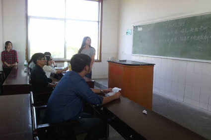 “从小爷爷对我说,吃水不忘挖井人……”,教室里传出阵阵动人的歌声,参加选拔的文新院各系新生们在用心唱着《在灿烂的阳光下》,歌声饱满悠长。上午9:10,选拔的活动已经进行了一半,广电二班的同学们在教室中认真聆听文娱部部长对歌曲的教习,接着,由本班同学按顺序演唱,不少同学表现优异。一位同学表示,“这首歌曲抒发了我们对党的感恩之情,我们一定要怀着一腔热血去唱好它。”