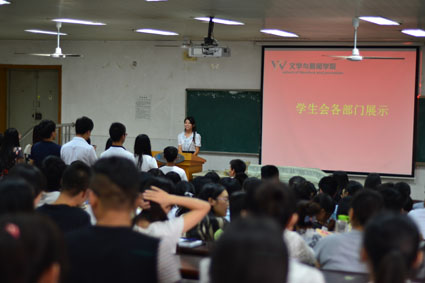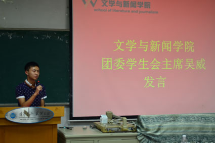 接着,团委学生会主席吴威也上台发言。他首先对大家的加入表示了欢迎,并希望新一届干事们可以珍惜未来的时光,由相遇到相知相熟,也希望大家静下心来,安静工作,快乐生活,爱上这里并且不愿离开。接着,学生会宣传部部长杨锦涛作为部长代表发言,他再次强调了学生会存在的意义在于为同学服务。杨锦涛也表示愿意做干事们工作上的引路人,生活中的朋友,也希望他们在学生会的大家庭里学会一些服务意识,提升一点专业素养,发展一些个人兴趣,付出并收获一份真情。之后,组织部的干事作为代表发言,再次阐述了为文新院服务,共铸学生会精彩未来的美好希冀。