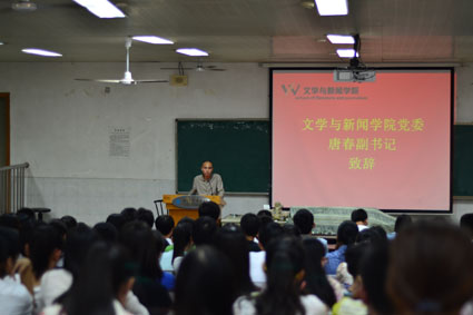 首先,是我院党委唐春副书记致辞。伊始,他表达了对第十四届学生会新干事的殷切期盼。希望干事们看清楚学生会为同学服务的目的,在拥有更多与大家接触机会的同时,服务大众、心系同学,而不仅仅将学生会当做锻炼自己与提高自身能力的平台。然后,他叮嘱新干事们牢记自己在校学生这一身份,在日常学习生活中,维护自己的形象,提高学习成绩。在班级当中,也要多参与班级劳动,发挥榜样作用。之后,唐春副书记又送了两点建议给全体同学。首先,不同省份、不同性格的同学们要团结起来,把各项事情做好,使学习生活丰富愉快。再有,各位同学要在不耽误学习时间的前提下做好学生会的工作,更好地为大家服务。对此,整个团委学生会要展开深入讨论,促进干事们工作的开展。最后,唐春副书记祝愿大家可以很好地完成各项任务,在学习生活上都有收获。