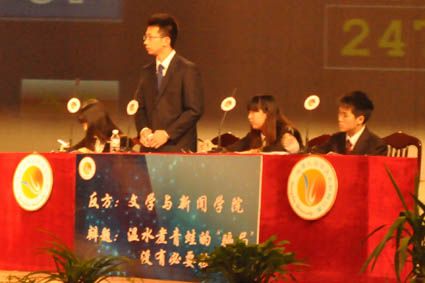 观众评委提问环节,双方辩手沉着应答。辩手在整场比赛中的精彩表现,也赢得了现场观众的阵阵掌声。大赛评委对本场比赛给予了赞扬。评委指出,在此次比赛中,双方辩手出色的口才,敏捷的思维,都展示了青年学子的良好形象。特别是我院的辩词引用了大量诗词,充分体现了我院文学特色。