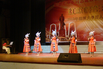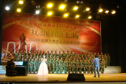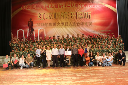 2013年10月10日晚7点30分,纪念毛泽东同志诞辰120周年系列活动之“红歌唱给主席听”2013湘潭大学百人合唱比赛在我校俱乐部隆重举行。经过两个小时的激烈比拼,我院凭借一首气势磅礴的《太行山上》,以9.70的高分获得一等奖。