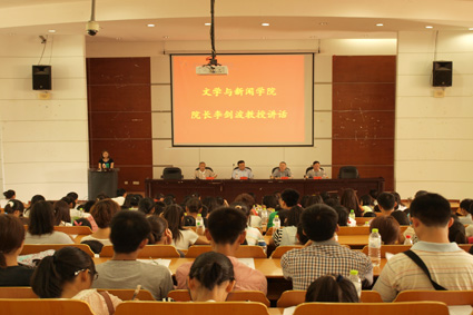 接着,党委书记王洁群教授发表讲话。王洁群教授分别介绍了我院汉语言文学专业、广告学专业、新闻学专业、广播电视新闻学专业的具体情况以及就业前景。王教授还提到,大学的教学方式不同于中学,希望新生们可以尽快适应新的教学方式,培养独立学习的能力,利用好没有课的自由学习时间,提高自己的综合素质。