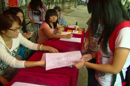 我院团委学生会有组织部、宣传部、青年志愿者实践部、文心报等14个部门,各部门职责不同、特点相异,可谓是各有千秋。北苑主干道上粘贴着由广告部手绘的14张海报,五颜六色的海报包容了每个部门的特色,吸引着往来的路人驻足欣赏。新生陆续到我院团委学生会招新摆点处咨询领表,团委学生会成员认真耐心地向前来咨询的新生介绍各部门情况。中午,北苑迎来人员流动的高峰期,到我院团委学生会摆点招新处咨询的新生人数也急剧增长。相对于3日而言,2日前来交表的同学居多,广大新生的表现积极、有礼貌,参与热情很高。