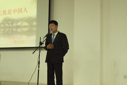 大赛开始前,我院团委学生会学习部精心编排的视频配音《中华诵之甄嬛版》、《中华诵之好声音版》,给全场观众带来欢笑,也点出比赛要注意的各方面事项,以便选手更好发挥。大赛在9位参赛选手的VCR自我介绍中拉开序幕,形式新颖,夺人眼球。随后,参赛选手身着正装依次登台朗诵。第一位登场的是13中文三班的姚东喜同学,一篇《我骄傲我是中国人》把对祖国的浓浓情谊抒发得淋漓尽致。5号来自13广告一班的王方方同学,用饱满的热情朗诵着“中国,中国,英雄的中国”,一篇《中国崛起,中国梦》感染着每一个人。7号来自13广电一班的黄嘉慧同学一身白裙惊艳全场,一篇《中华颂》轻重缓急得当,声情并茂,赢得台下阵阵掌声。