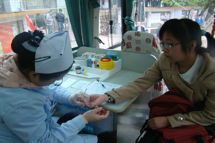 “这是我第三次献血了”来自11级中文系的叶晋萍同学在得知本次献血活动后,早早地就来到了南苑等候,“地震面前,我虽然不能亲自到现场去,但通过献血,我也能为雅安做点事情,很开心。”采完血后,她笑着说:“相比前两次,我觉得这次献血更加实用。”