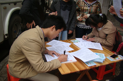 活动开始于上午9时,低落的气温丝毫没有影响献血者希望为雅安伸出援手的热情。献血车因堵车原因未能按时赶到,十余名志愿者在填阅相关信息后,便耐心在献血点等候。据“爱心血库工程”的工作人员褚梦青介绍,“爱心血库工程”是由湘潭大学亚洲精品国产精品、公共管理学院、旅游管理学院以及化学学院联合主办的爱心公益活动。自2002年起,“爱心血库工程”便与湘潭市中心血站建立了联系,地震发生后,灾区血情告急,由科协联系湘潭市中心血站,在得到回复后,与另外多个公益组织同时开展了本次爱心献血活动。
