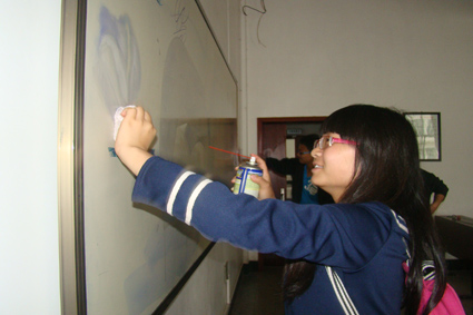 随后志愿者开始清洗教室白板。教室白板上难以擦洗掉的主要是一些用油性笔写的小广告。志愿者们首先请教了逸夫楼的设备保养员清洗白板的方法。随后用清洗剂一点一点清洗白板上的字迹。为了高效率完成志愿任务,他们分成三队分头进行擦洗任务,确保每层楼每个教室都能清理干净。遇到难以清理的字迹时,就先用清洗剂喷洒,再用抹布一点点擦拭。每个志愿者都认真地完成自己负责的任务,努力将每块白板上的字都擦干净。志愿者胡琼告诉记者:老师上课时会在白板上做板书,但是白板上充斥着这么多广告都无法下笔,而且也影响老师上课的心情,清洗干净后方便老师上课,是一件很有意义的事情。设备管理员刘阿姨说:“志愿者做的事情为同学们提供了方便也减轻了我们的工作量,希望这样的活动能常态化。”