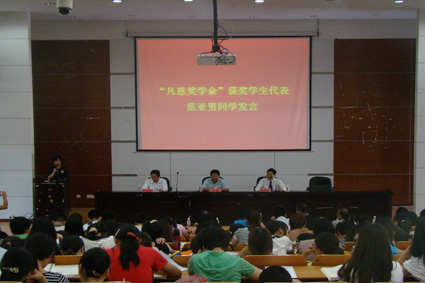 会议由我院院长季水河教授主持,在庄严的国歌中开始。季水河教授在简单介绍“凡恩奖学金”情况后,宣读了2011-2012年度“凡恩奖学金”颁奖决定,由高源先生、左泽亮先生为获奖同学颁奖。他们分别是:范亚男、张彩云、范伟森、刘立、文衡玉、闫杰、惠荣、郝羚君、张文慧九位同学。